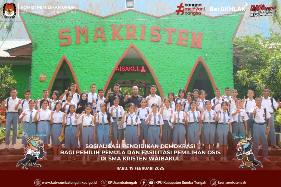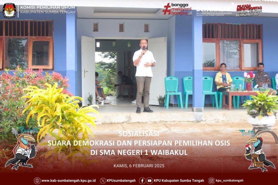 #TemanPemilih Komisi Pemilihan Umum Kabupaten Sumba Tengah melakukan Sosialisasi Suara Demokrasi dan Persiapan Pemilihan Osis di SMA Negeri 1 Waibakul, 06 Februari 2025. Kegiatan ini dibuka oleh Kepala SMA Negeri 1 Waibakul, Erli Rambu Liwa Sabaora, S.Si. Dalam sambutannya, Kepala SMAN 1 Waibakul menyampaikan terima kasih kepada KPU yang telah memberikan Sosialisasi Suara Demokrasi dan mendukung penyelenggaraan Pemilihan Osis di SMAN 1 Waibakul. Ia berharap kerjasama ini dapat terus ditingkatkan guna pendidikan demokrasi bagi siswa dan para calon Pemilih Pemula. Hadir sebagai narasumber kegiatan ini, Ketua KPU Kabupaten Sumba Tengah, Fredy Umbu Bewa Guty dan Anggota KPU Kabupaten Sumba Tengah Akbar Abbas Abdullah. Pada kesempatan ini, Ketua KPU Sumba Tengah menjelaskan pentingnya demokrasi dan Pemilu yang diselenggarakan secara rutin sebagai salah satu syarat negara demokrasi. Ia juga menjelaskan serta pentingnya menggunakan hak suara dalam memilih dan menentukan pemimpin. Ketua KPU Sumba Tengah juga mengajak agar siswa SMAN 1 Waibakul untuk memaknai proses Pemilihan Osis sebagai sarana pembelajaran berdemokrasi yang baik di Sekolah dan perlu untuk terus diselenggarakan secara demokratis. Selanjutnya, Anggota KPU Sumba Tengah, Akbar Abbas Abdullah menambahkan terkait pengertian dan pentingnya demokrasi serta menegaskan bahwa demokrasi merupakan kekuasaan tertinggi ada dalam tangan rakyat. Kegiatan dilanjutkan dengan pemberian materi kepada Panitia Pemilihan Osis SMAN 1 Waibakul berupa Tata Cara Pemilihan dan Persiapan Pemilihan Osis SMAN 1 Waibakul. Turut hadir dalam kegiatan Para Guru SMAN 1 Waibakul, Kasubbag dan Staf KPU Kabupaten Sumba Tengah, serta seluruh Siswa SMAN 1 Waibakul.