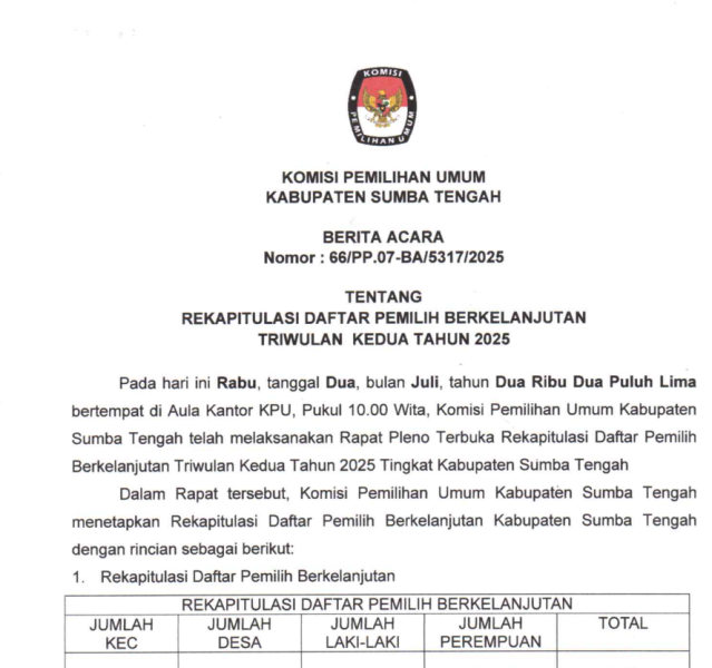 Berita Acara Nomor : 66/PP.07-BA/5317/2025 Tentang Rekapitulasi Daftar Pemilih Berkelanjutan Triwulan Kedua Tahun 2025.