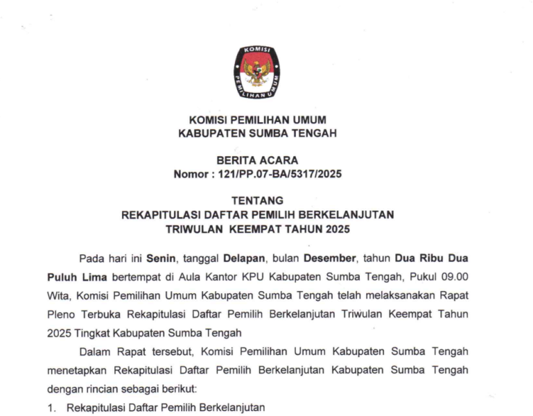 Berikut merupakan Berita Acara dari Rapat Pleno Terbuka Rekapitulasi Daftar Pemilih Berkelanjutan (PDPB) Triwulan Keempat 2025 yang diselenggarakan pada 8 Desember 2025, oleh KPU Kabupaten Sumba Tengah, bersama dengan Disdukcapil, Bawaslu, Kodim 1613 Sumba Barat, dan Polres Sumba Barat.