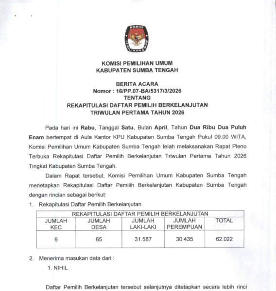 Berikut merupakan Berita Acara dari Rapat Pleno Terbuka Rekapitulasi Daftar Pemilih Berkelanjutan (PDPB) Triwulan Pertama Tahun 2026 yang diselenggarakan pada 1 April 2026, oleh KPU Kabupaten Sumba Tengah.