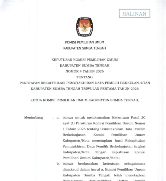 Keputusan Tentang Penetapan Rekapitulasi Pemutkahiran Data Pemilih Berkelanjutan Kabupaten Sumba Tengah Triwulan Pertama Tahun 2026