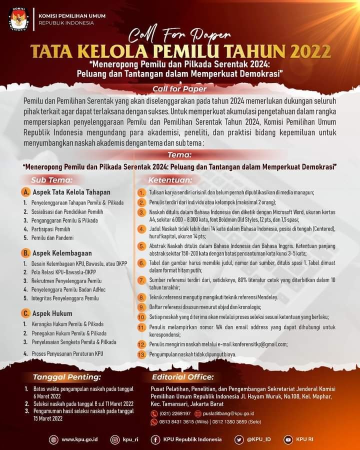 Pengumuman Call For Paper Konferensi Nasional Tata Kelola Pemilu Tahun 2022 Rabu, 02 Maret 2022 00:00 714 https://kab-sumbatengah.kpu.go.id/public/kab-sumbatengah/dmdocument/1646358858149 PENGUMUMAN CALL FOR PAPER KONFERENSI NASIONAL TATA KELOLA PEMILU TAHUN 2022 .pdf Bagikan: Telah dilihat 714 kali