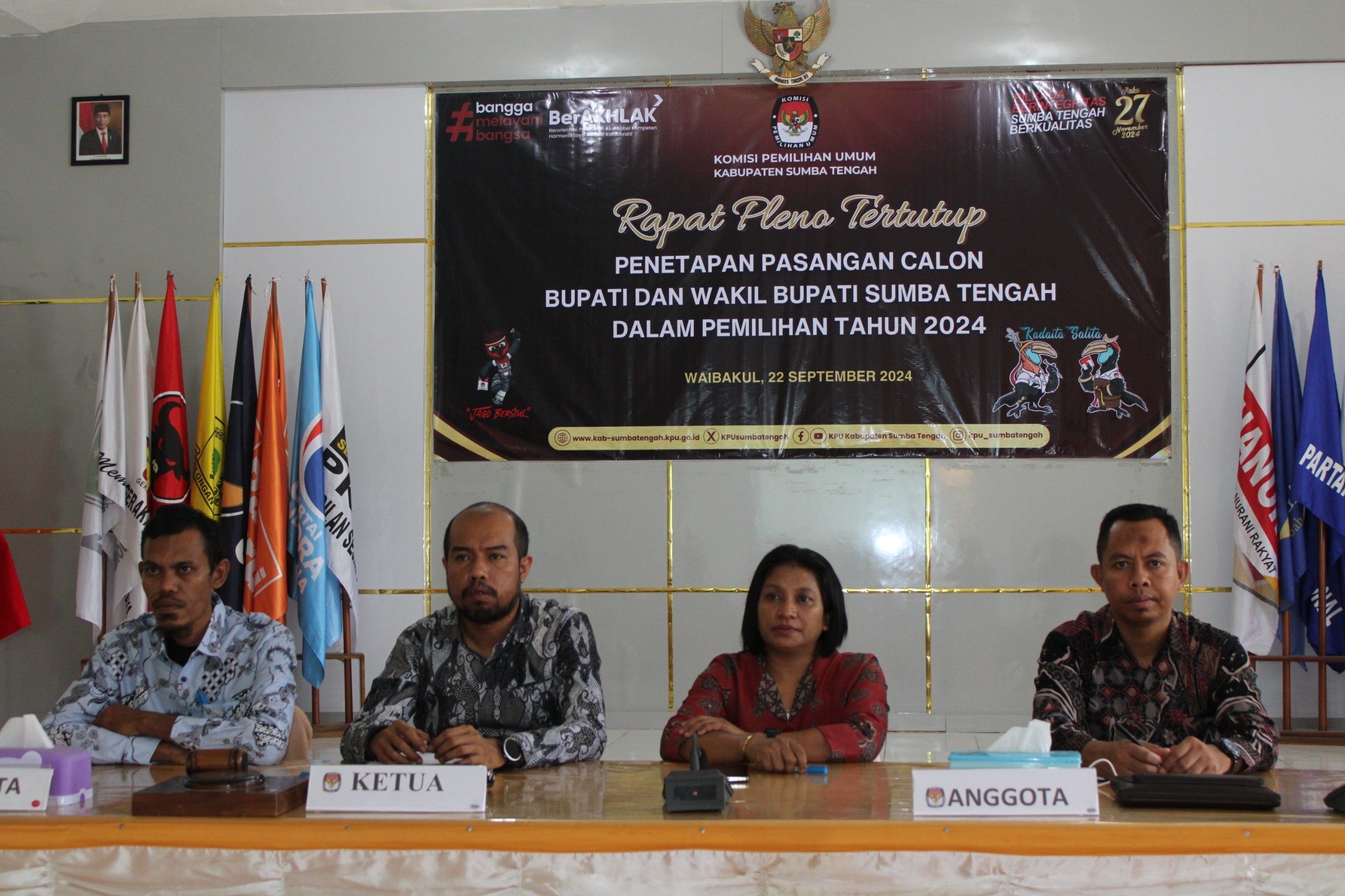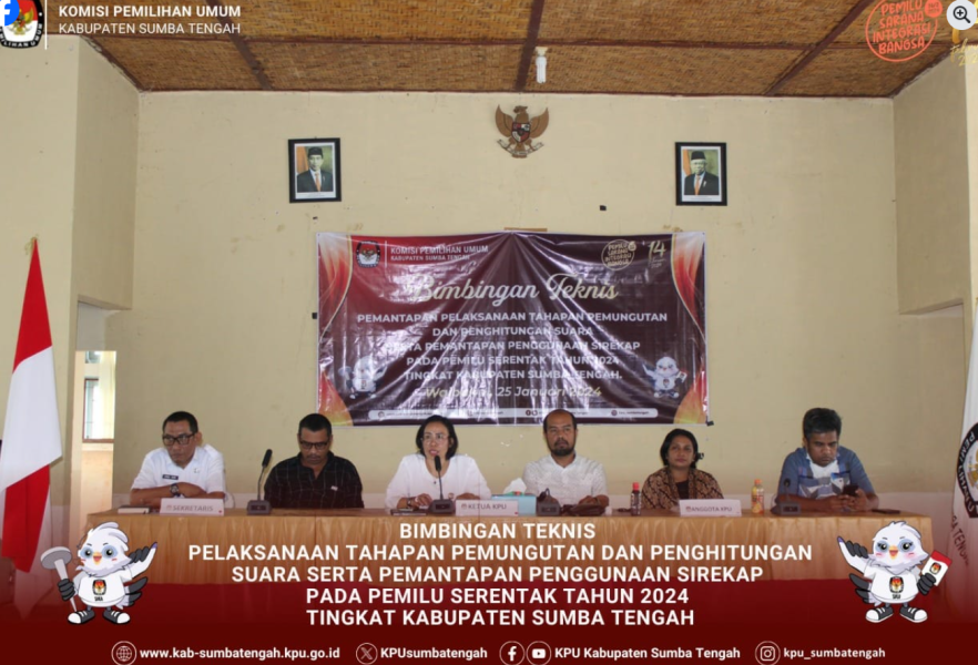 Komisi Pemilihan Umum Kabupaten Sumba Tengah melaksanakan Sosialisasi Rencana Pembangunan Jangka Panjang Daerah (RPJPD) Tahun 2025 - 2045 Dalam Rangka Penyusunan Visi dan Misi Calon Bupati dan Wakil Bupati Sumba Tengah Tahun 2024 di Aula KPU Kabupaten Sumba Tengah pada Jumat, 23/08/2024. Ketua KPU Kabupaten Sumba Tengah, Fredy Umbu Bewa Guty bersama para Anggota KPU Kabupaten Sumba Tengah, Mariana Lilo Ludji, Angelina Rambu Piras, dan Fahril, serta Sekretaris KPU Kabupaten Sumba Tengah, Kh. Umbu Tamu Hawu menyambut kedatangan Pj. Bupati Sumba Tengah Dr. Drs. Jusuf Lery Rupidara, M.Si sebagai narasumber dalam kegiatan Sosialisasi. Pj. Bupati Sumba Tengah Dr. Drs. Jusuf Lery Rupidara, M.Si membawakan materi terkait Rancangan Teknokratik RPJMD Kabupaten Sumba Tengah Tahun 2025 - 2029. Dalam pemaparan materi, Pj. Bupati menekankan beberapa point yang perlu diperhatikan oleh Tim dari masing-masing Bakal Calon Bupati dan Wakil Bupati Sumba Tengah dalam mendesain visi dan misi. Pada kesempatan ini juga Pj. Bupati menyampaikan terima kasih kepada KPU Kabupaten Sumba Tengah yang telah menyelenggarakan tahapan Pilkada hingga saat ini dan harapanya agar proses yang dilakukan tetap sasuai asas Pemilu dan berjalan dengan damai. Selanjutnya pemaparan materi oleh Kepala BAPPELITBANGDA Melkianus Umbu Ngailu, SP terkait Rancangan Teknokratik Rencana Pembangunan Jangka Panjang Daerah (RPJPD) Kabupaten Sumba Tengah Tahun 2025-2045. Dalam pemaparan materi Kepala BAPPELITBANGDA menyampaikan terkait kondisi dan potensi - potensi yang tersedia pada daerah Kabupaten Sumba Tengah yang dapat dikelola dengan baik. Sesi selanjutnya, dilanjutkan dengan diskusi dan tanya jawab antara peserta dengan Narasumber, terkait materi sosialisasi yang berjalan dengan baik dan interaktif. Hadir pada kegiatan ini Kasat Reskrim Polres Sumba Barat, Intel Dandim 1613 Sumba Barat, Staf Sekretariat Bawaslu Kabupaten Sumba Tengah, Pimpinan Partai Politik Peserta Pemilu, Tim Penghubung Bakal Calon Bupat dan Wakil Bupati Sumba Tengah, Para Kasubbag serta Staf Sekretariat KPU Kabupaten Sumba Tengah.