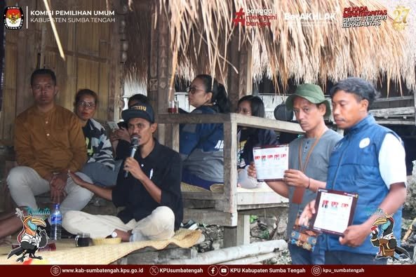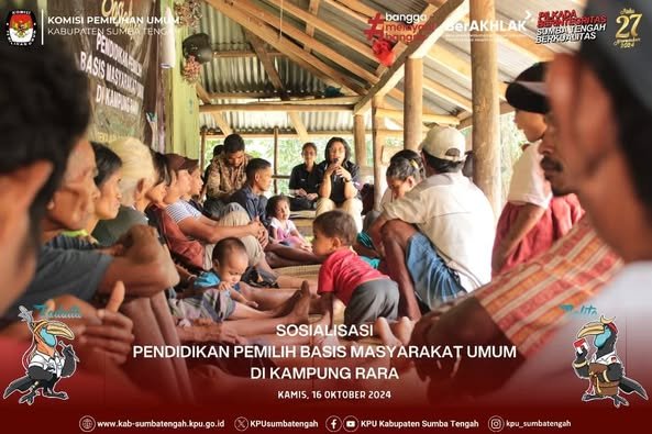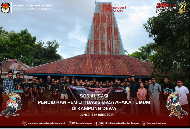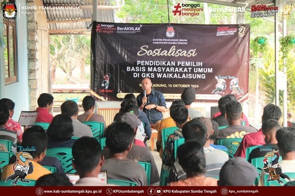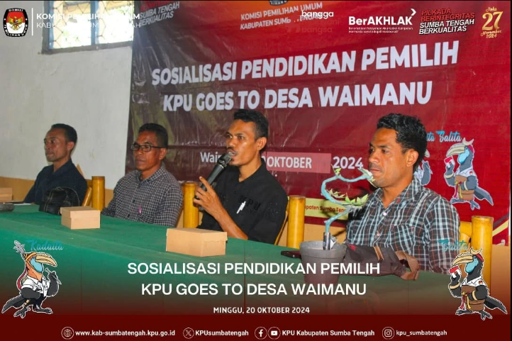 Komisi Pemilihan Umum Kabupaten Sumba Tengah menggelar Sosialisasi Pendidikan Pemilih Basis Masyarakat Umum di Kantor Desa Waimanu, Desa Waimanu, Kecamatan Katiku Tana Selatan pada Minggu, 20/10/2024. Dalam sapaan pembuka Plh. Ketua KPU Kabupaten Sumba Tengah, Akbar Abbas Abdullah, menyampaikan terima kasih kepada Bapak/Ibu yang telah menyambut baik kegiatan Sosialisasi Pendidikan Pemilih di Kantor Desa Waimanu. Selanjutnya Plh. Ketua KPU Sumba Tengah menyampaikan akan pentingnya partisipasi masyarakat dalam menggunakan hak pilihnya pada pemilihan Gubernur dan Wakil Gubernur serta Bupati dan Wakil Bupati. Ia juga mengingatkan agar masyarakat dapat memastikan telah terdaftar sebagai Daftar Pemilih Tetap (DPT) dengan mengecek pada cekdptonline.go.id. Pada kesempatan ini juga Plh. Ketua KPU Kabupaten Sumba Tengah memperkenalkan Pasangan Calon Gubernur dan Wakil Gubernur Provinsi Nusa Tenggara Timur serta Bupati dan Wakil Bupati Sumba Tengah dan mengingatkan bahwa hari Rabu, 27 November 2024 adalah hari Pemilihan Kepala Daerah (Pilkada) serta ia menghimbau agar para Pemilih mempersiapkan dokumen yang akan dibawa di TPS yaitu, Kartu Tanda Penduduk (KTP-EL) atau Biodata Diri dari Dinas Kependudukan dan Pencatatan Sipil Kabupaten Sumba Tengah dan Formulir Model C Pemberitahuan-KPU (Undangan mencoblos). Plh. Ketua KPU Kabupaten Sumba Tengah juga menegaskan agar tidak menggadaikan hak pilih dengan menerima uang atau melakukan praktik money politik dan menghindari berita hoaks serta tidak Golput. Selanjutnya diskusi bersama peserta dan penyampaian penjelasan oleh Plh. Ketua KPU Kabupaten Sumba Tengah serta pembagian doorprize kepada peserta Sosialisasi. Hadir dalam Kegiatan Sosialisasi Kasubbag KPU Kabupaten Sumba Tengah, Kepala Desa Waimanu, Staf Sekretariat KPU Kabupaten Sumba Tengah, PPK Katiku Tana Selatan dan PPS Waimanu.