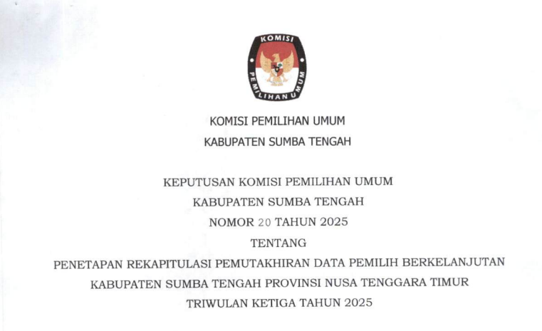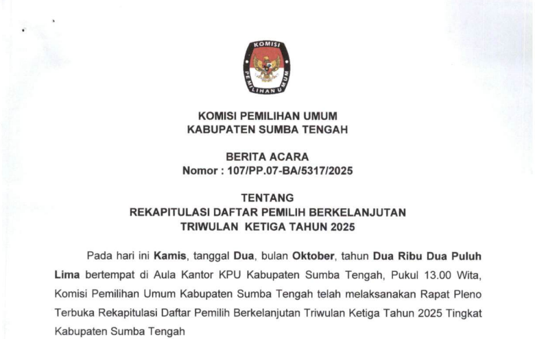 Pada hari ini Kamis, tanggal Dua, bulan Oktober, tahun Dua Ribu Dua Puluh Lima bertempat di Aula Kantor KPU Kabupaten Sumba Tengah, Pukul 13.00 Wita, Komisi Pemilihan Umum Kabupaten Sumba Tengah telah melaksanakan Rapat Pleno Terbuka Rekapitulasi Daftar Pemilih Berkelanjutan Triwulan Ketiga Tahun 2025 Tingkat Kabupaten Sumba Tengah