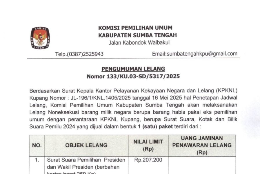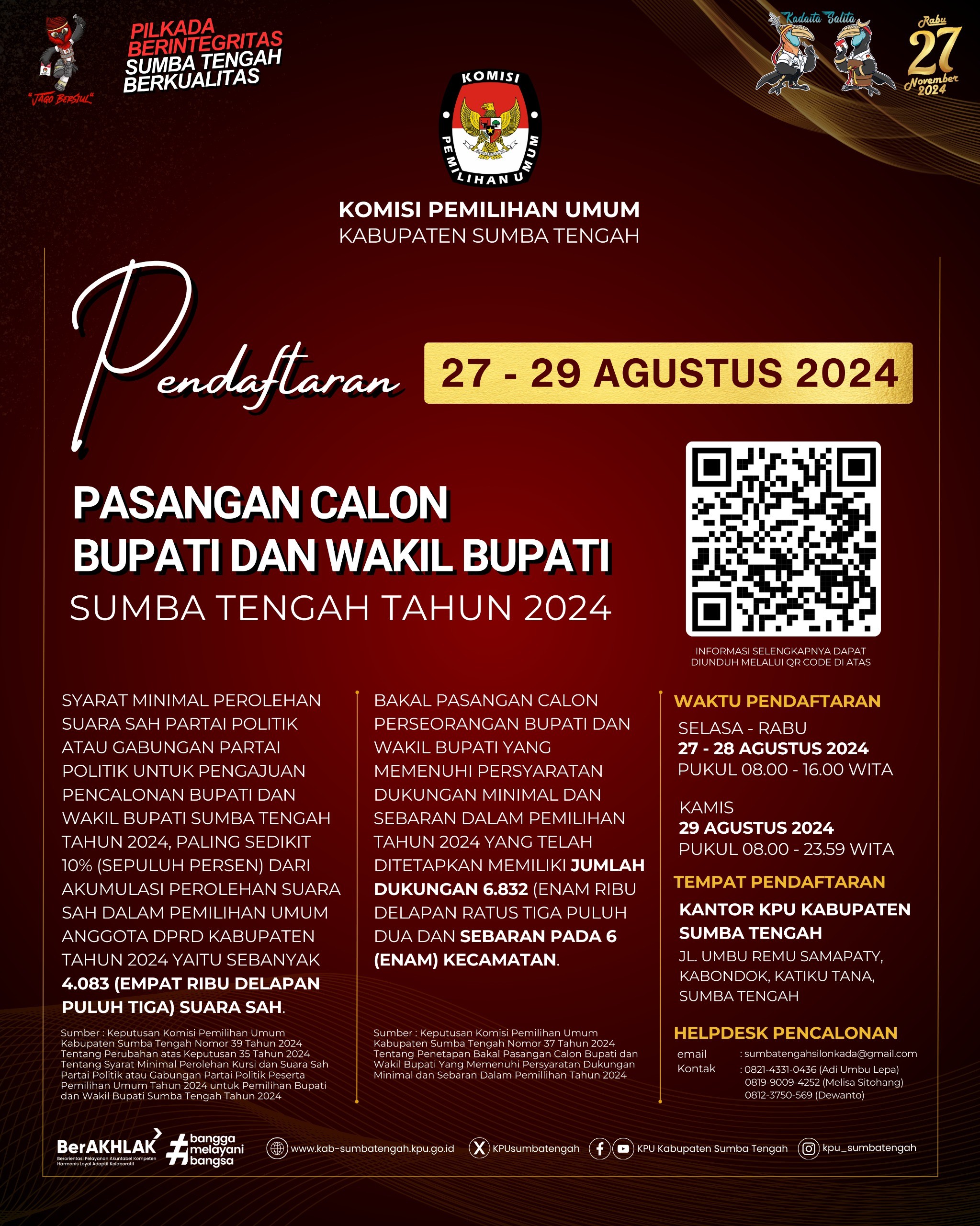 KPU Sumba Tengah mengeluarkan Pengumuman Hasil Penerimaan LADK Perbaikan Pasangan Calon Peserta Pemilihan ini dengan Nomor 442/PL.02.5-Pu/5317/2024.