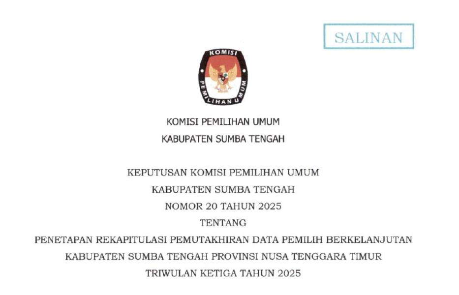 Pada hari ini Rabu, tanggal Dua, bulan Juli, tahun Dua Ribu Dua Puluh Lima bertempat di Aula Kantor KPU, Pukul 10.00 Wita, Komisi Pemilihan Umum Kabupaten Sumba Tengah
