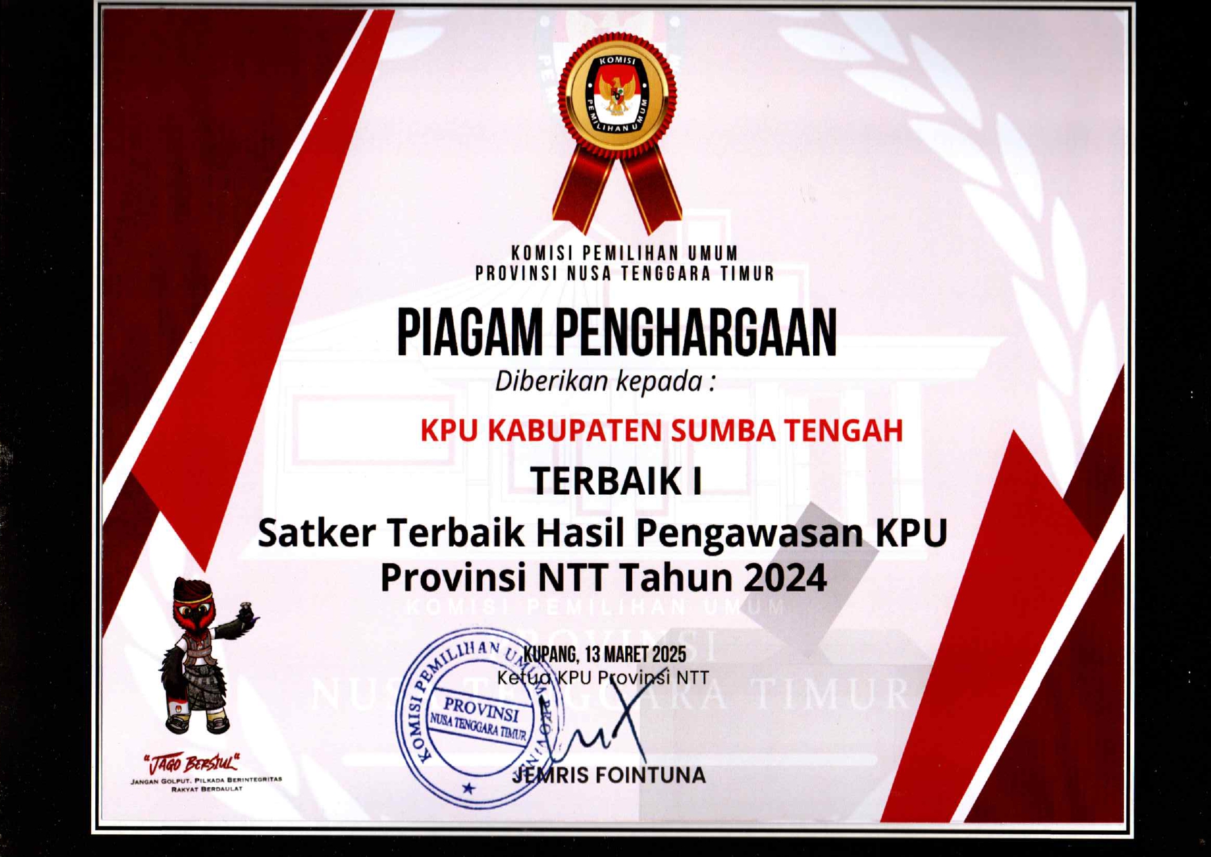 Terbaik I Satker terbaik Hasil Pegawasan KPU Provinsi NTT Tahun 2024